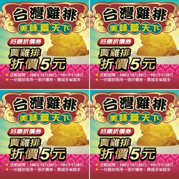 行政院農業委員會、財團法人中央畜產會及中華民國養雞協會為了讓民眾多多享用國產雞胸肉鮮嫩多汁和優質口感,,聯合雞排店家推出"買雞排,折價5元"的優惠好康,活動期間從100年12月30日至101年1月8日,民眾只要手持5元雞排折價券至合作雞排店家消費,享用熱騰騰的雞排美食之外,也能輕鬆省荷包。